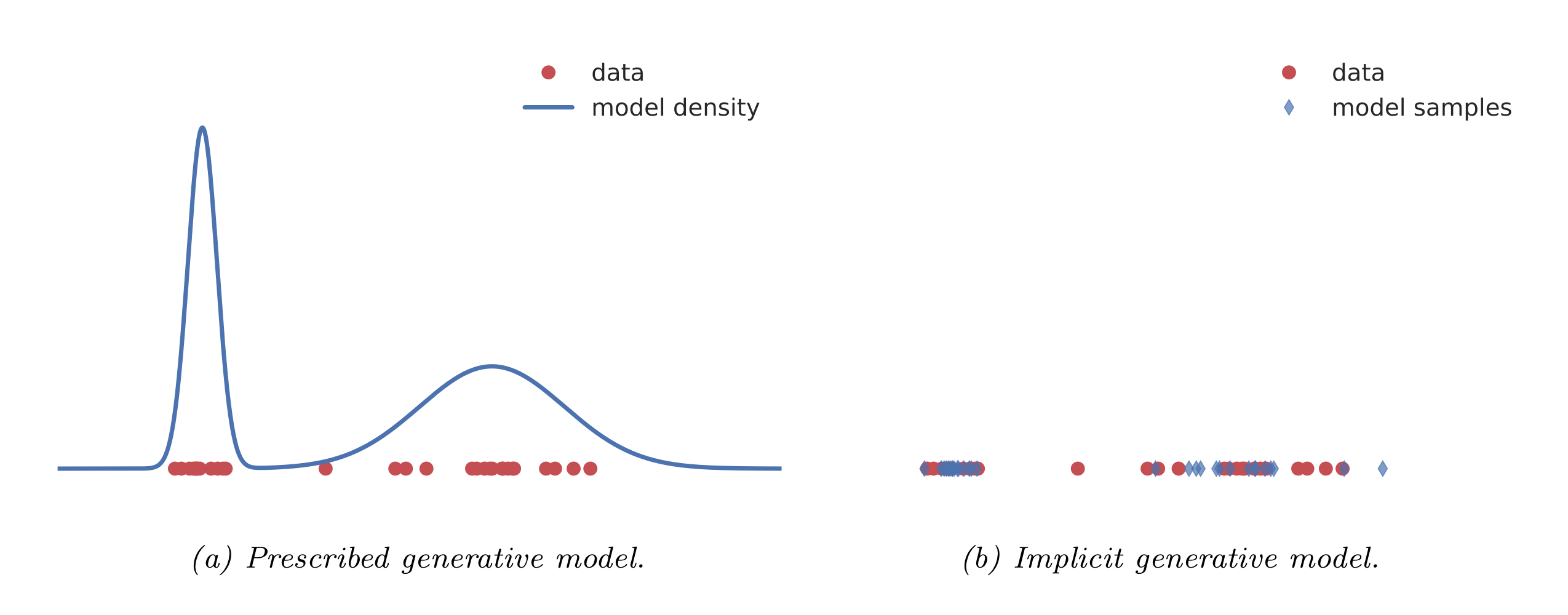 명시적 모델Explicit probabilistic models은 주어진 데이터로부터 데이터가 생성되는 확률분포를 어떠한 모수 θ를 사용한 가능도로 나타내는 것을 말한다 (그림 a). 예를 들어, VAE의 경우 생성모델의 가능도를 학습 과정에서 직접 이용하기 때문에, 이러한 구분에 속한다. 반면, 암시적 모델Implicit probabilistic models은 데이터의 확률분포를 학습하기보다는, 직접적으로 데이터를 생성하는 확률적인 과정을(stochastic process는 아님) 정의한다 (그림 b). 암시적 모델의 표현은 다음과 같이 이루어진다.