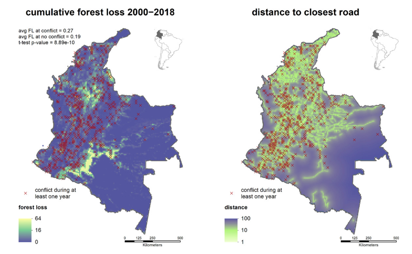 왼쪽 : 처치변수(Conflict, 빨간색 마커) vs. 결과변수(Forest loss, 격자형), 오른쪽 : 공변량(도로까지의 거리)