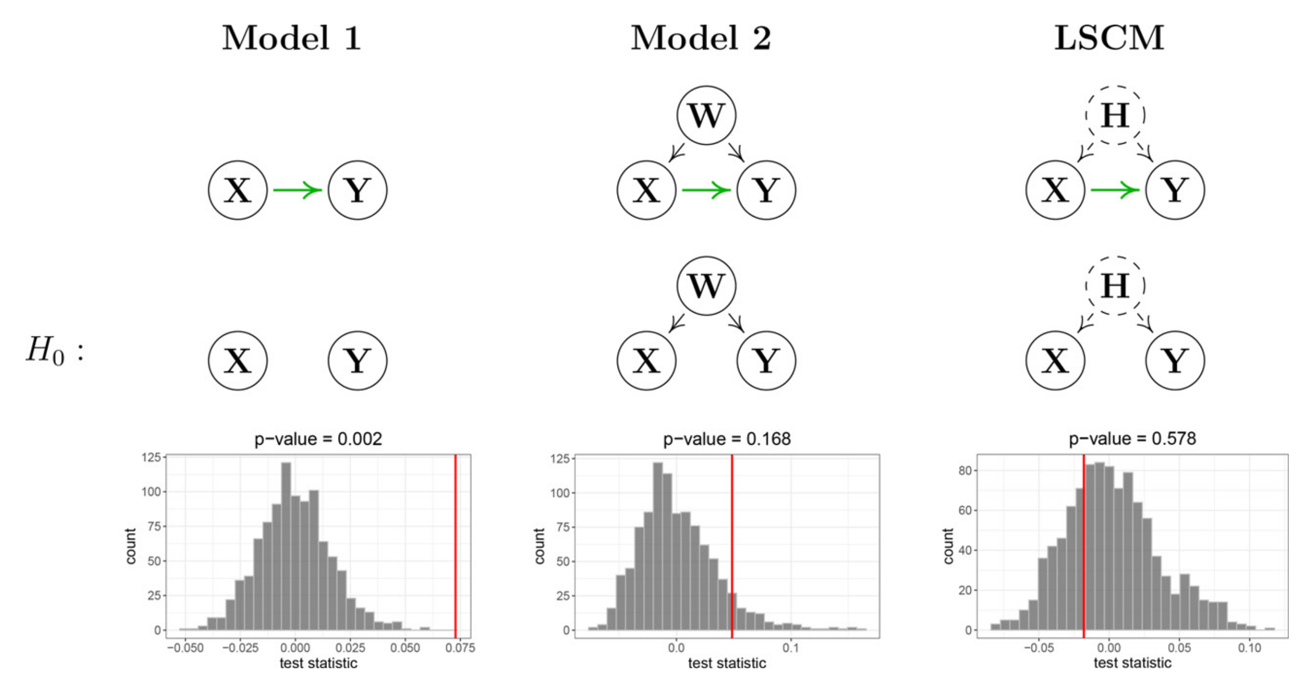 위 그림은 논문에서 제안한 방법론을 통해 검정한 결과입니다. 왼쪽은 두 변수만 이용해 단순한 검정을 수행한 결과이며, 가운데는 를 추가하여 검정한 결과를, 오른쪽은 와 관측되지 않는 time-invariant한 잠재변수 를 추가하여 검정한 결과입니다.