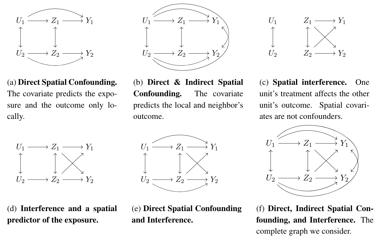 그런데, 공간 데이터 관점에서 살펴보면 아래와 같이 세 가지 경우를 생각할 수 있습니다. 이 논문에서는 두번째 경우인 (b)를 상정하며, 여기에서는 공간 간 간섭이 각 변수 수준에서는 존재하고 (양쪽방향 화살표), 간섭 효과( 등)이 존재하지만 confounder 수준에서의 간섭효과()는 존재하지 않는다고 가정합니다. 또한, confounder 변수 내에서의 공간 종속성이 존재하고() 이를 spatial confounding이라고 합니다.